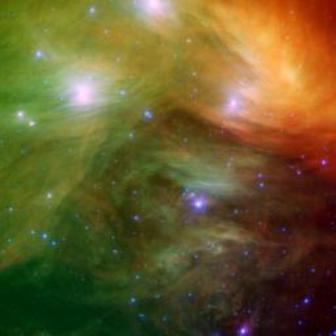 [N.T. – O texto que segue é uma Cortesia do Laboratório de Jato-Propulsão da NASA]. As Sete Irmãs, também conhecidas Plêiades, um aglomerado de estrelas, parecem flutuar numa cama de plumas nesta nova imagem de infra-vermelho do Telescópio Spitzer Space da NASA. Nuvens de pó circundam as estrelas, envolvendo-as num véu esvoaçante.