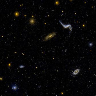 [N.T. – O texto que segue é uma Cortesia do Laboratório de Jato-Propulsão da NASA]. A imagem de Ultra-Violeta vista acima corresponde a um grupo de diversos tipos de galáxias. NGC 3190 é uma galáxia do tipo disco espiralado de pó. NGC 3187 já é uma galáxia com forma altamente distorcida. Essas duas galáxias estão separadas por apenas 35 kilo-parsecs (o que corresponde à metade do diâmetro da nossa Via Láctea). Uma galáxia em forma de um anel elíptico, e uma outra de forma irregular também estão presentes.