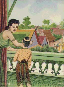 A Princesa BimbaYashodhara diz ao filho Rahula para ir ver seu Pai, o Príncipe Siddharta.