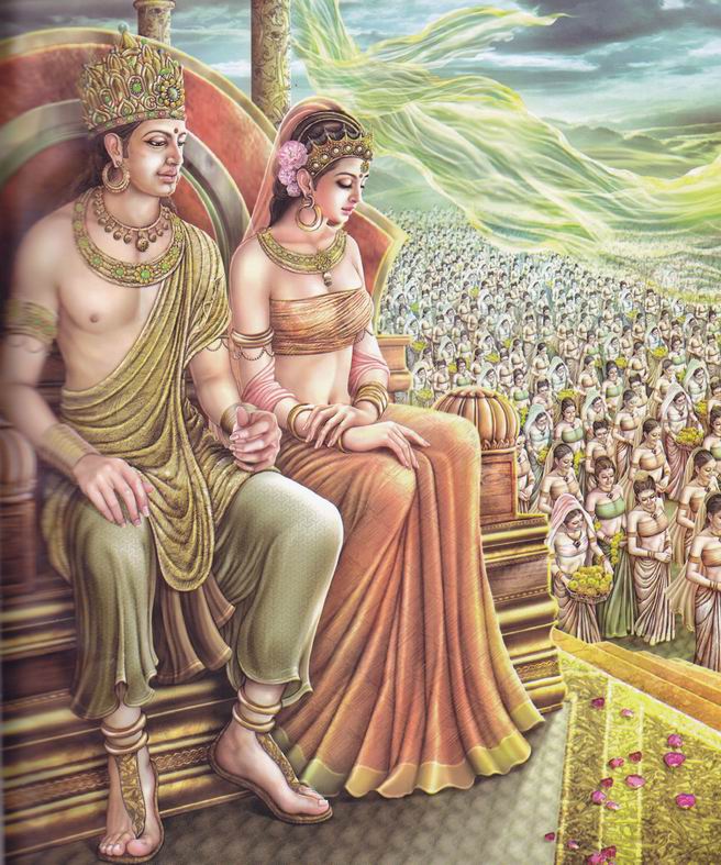 Ela era muito bela. Era como se a própria Deusa Lakshmi devaneasse pelo mundo. Quando ela falava, era como o cântico dos pássaros na primavera, e suas palavras eram doces e agradáveis. Seus cabelos eram da cor da abelha negra; sua fronte tão casta quanto um diamante; seus olhos tão ternos quanto uma jovem folha do lótus azul; e nenhuma carranca demarcava as curvas requintadas das suas sobrancelhas.